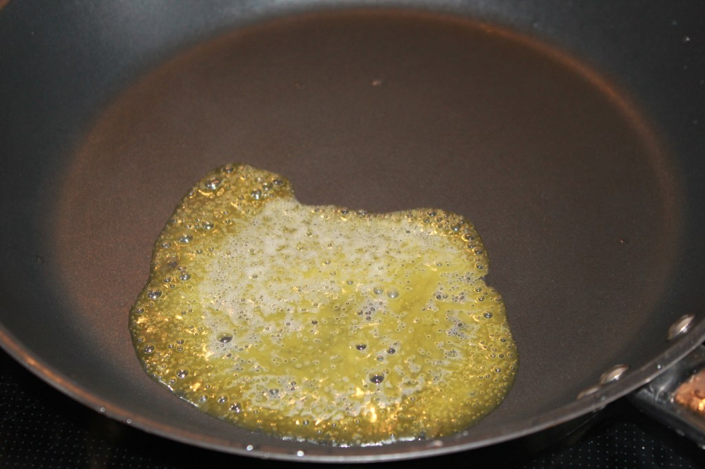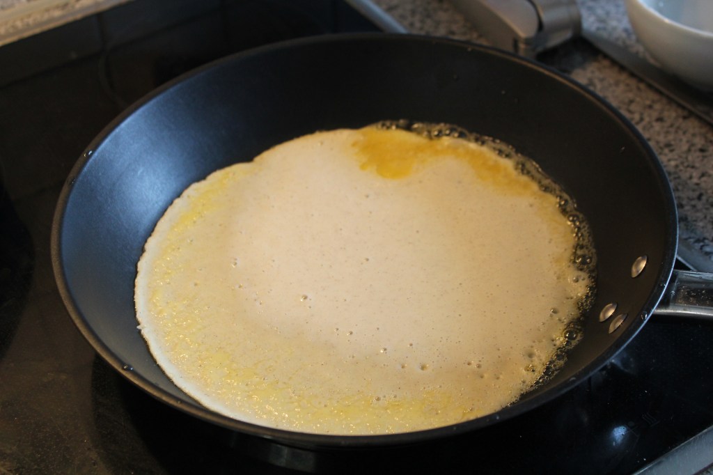 Bevor die Pfannkuchen gebacken werden, rührst du den Teig nochmals um. Nun erhitzt du Öl in einer beschichteten Pfanne (ca. 2 Teelöffel). Wenn das Fett heiß ist (Herd erstmal mittlere Hitzestufe), fülle mit einer Kelle eine Portion Teig in die Pfanne. Je mehr Teig du in die Pfanne füllst, desto dicker wird der Pfannkuchen. Ich nutze nicht so viel Teig, sondern sorge durch Schwenken der Pfanne dafür, dass sich der Teig dünn verteilt. Nun lässt du den Pfannkuchen ausbacken. Gewendet wird der Pfannkuchen zum ersten Mal, wenn der Teig stockt. Danach backt ihr ihn so lange, bis euch der Bräunungsgrad gefällt (im Beispiel wurde dreimal gewendet).