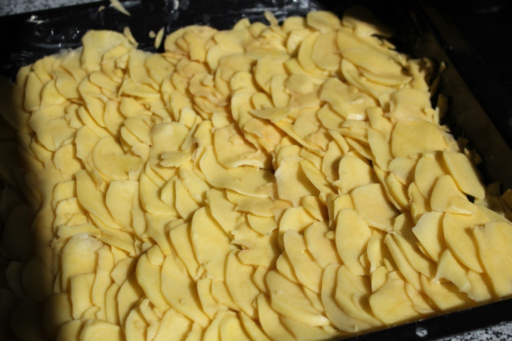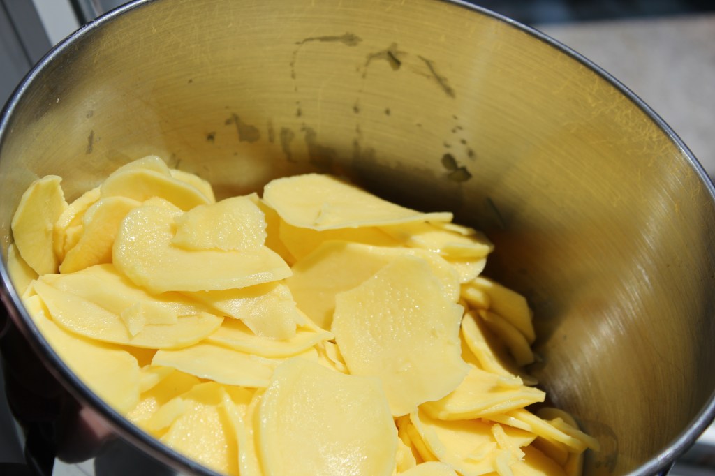 - Danach die Kartoffeln in möglichst feine Scheiben schneiden. Am einfachsten geht das mit einem Gemüsehobel oder einer Küchenmaschine.