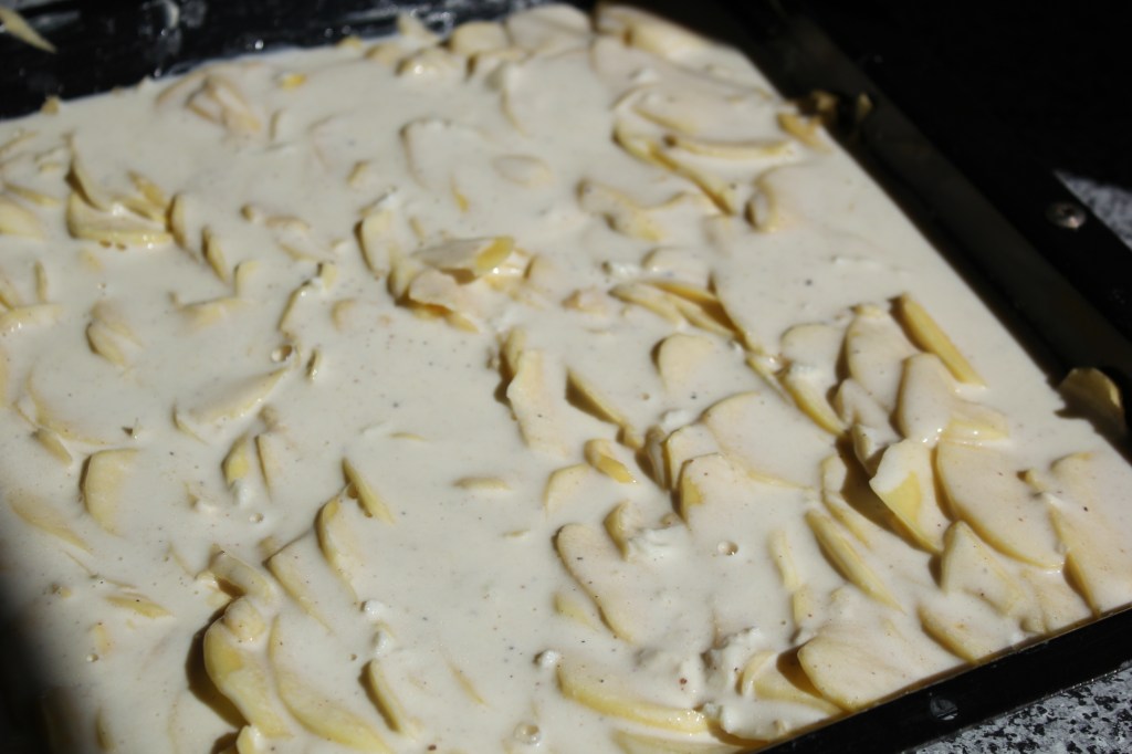 - Kartoffeln auf das gefettete Backblech schichten. Am besten nutzt du die sogenannte „Fettpfanne“ (tieferes Backblech). Es funktioniert aber auch mit dem normalen Blech oder einer grossflächigen Auflaufform. Wichtig ist, dass die Kartoffeln flach geschichtet werden (siehe Bilder). Gieße die Soße aus dem Topf über die Kartoffeln.