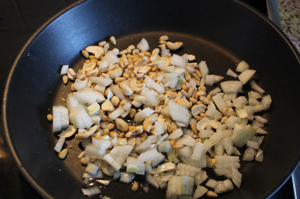 - Pinienkerne, Cashewkerne und Zwiebeln in die vorgeheizte Pfanne geben.