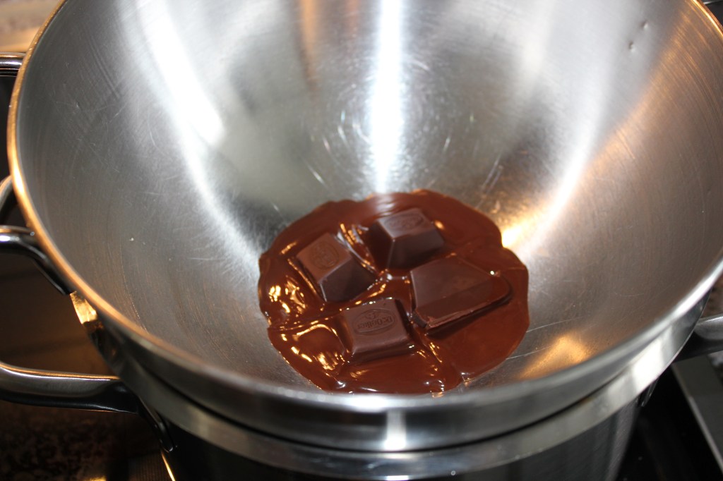 - Die Zartbitterkuvertüre über einem Wasserbad schmelzen.