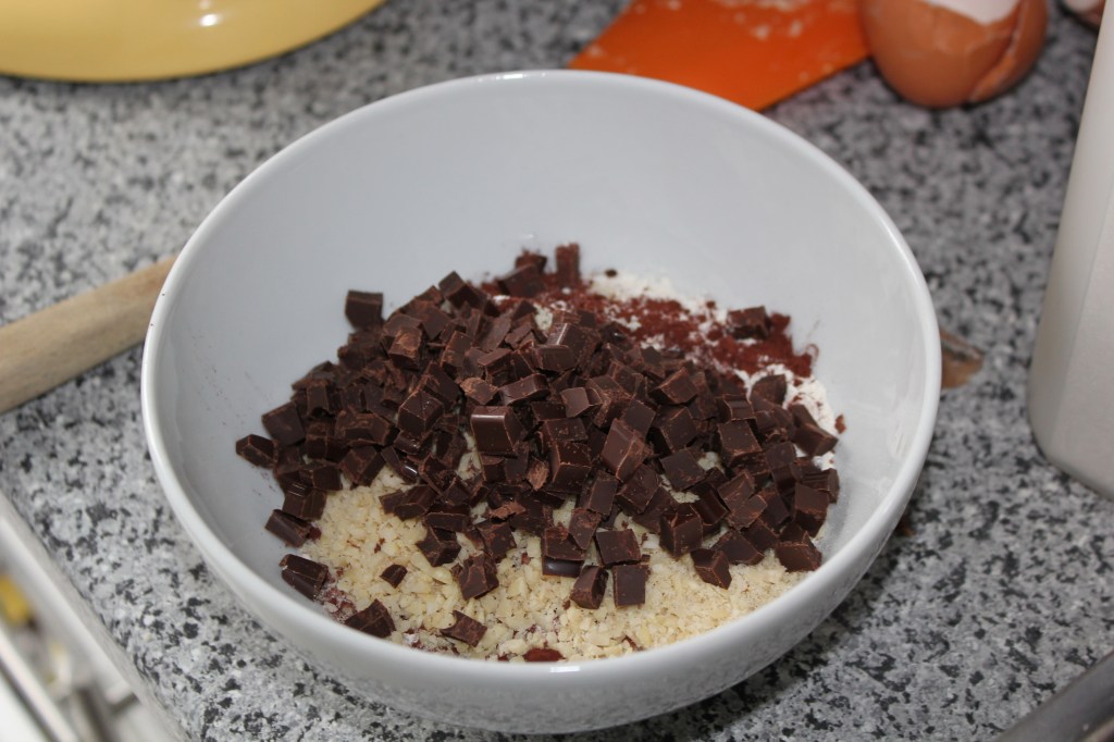 - Mehl, Kakao, Mandeln, grob gehackte Schokolade und 1/2 TL Backpulver in einer separaten Schüssel mischen.