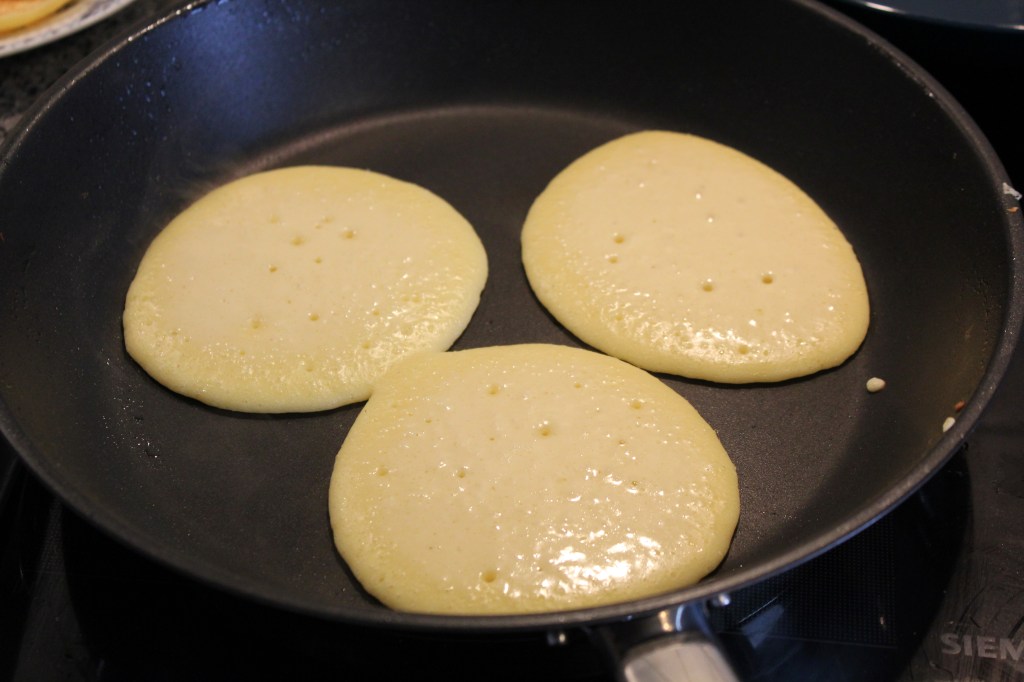 - Jeweils 3 Pancakes (je 2 EL Teig) von jeder Seite goldbraun braten (2,5-3 Minuten).
