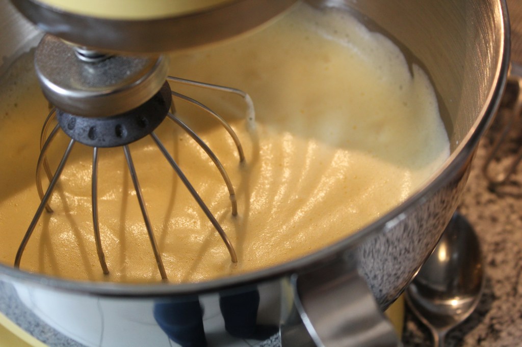 - Eier und Zucker in einer Rührschüssel mit den Schneebesen des Rührgerätes dickcremig schlagen.