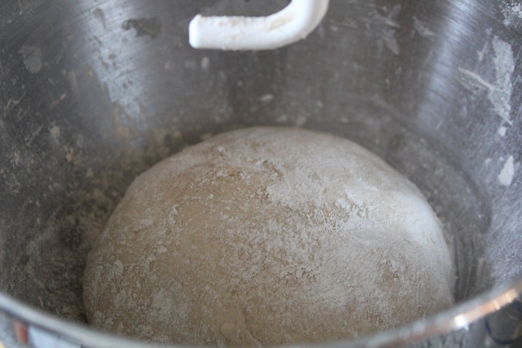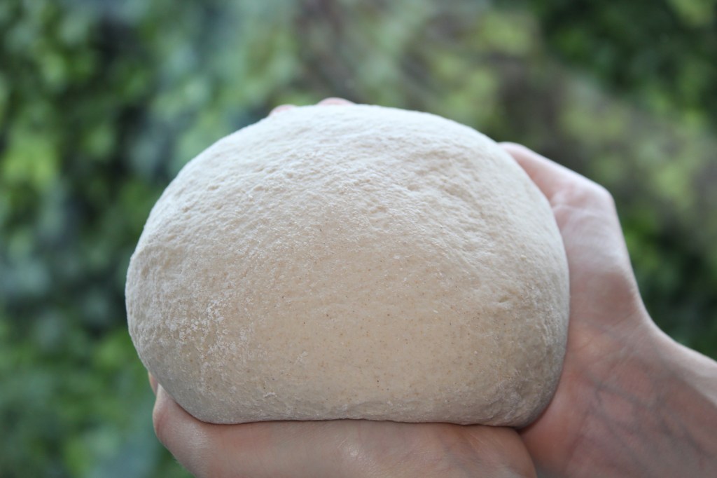 - Die Teigkugel auf der Oberfläche mit Mehl bestäuben und aus der Schüssel heben. Unter dem Teig die Schüssel mehlen.