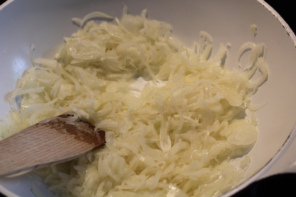 - Fertig gehobelte Zwiebeln in 2 EL Öl andünsten, bis sie glasig werden (ca. 5-7 Minuten).