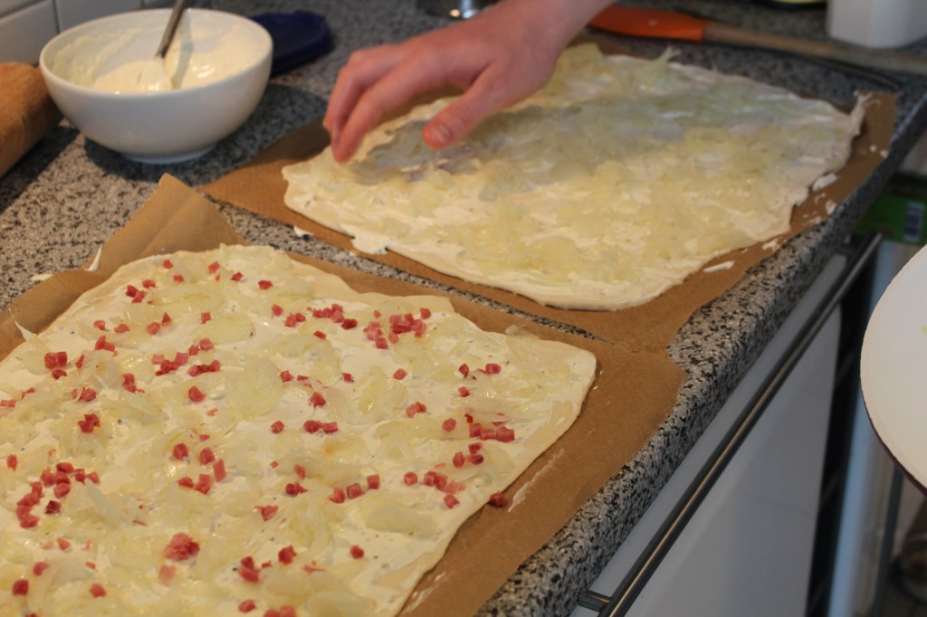 - Jede Platte mit Creme fraiche bestreichen und mit Zwiebeln bzw. Schinkenwürfeln belegen.