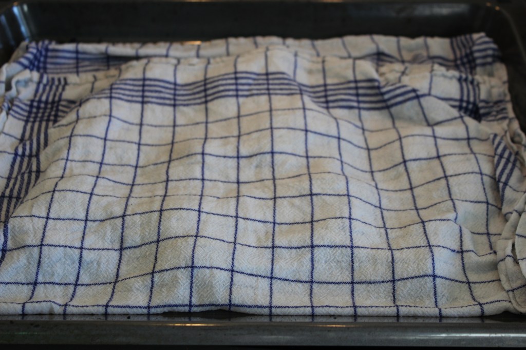 - Feuchte ein Geschirrtuch mit Wasser an, auswringen und lege es über die Paprikahälften.