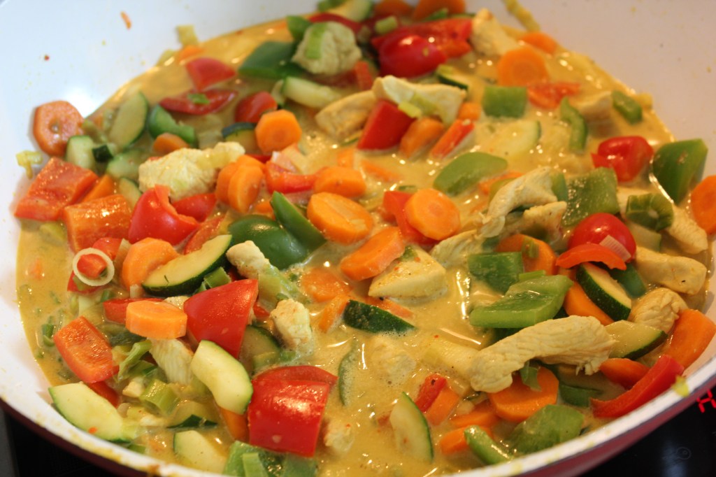 Curry gibt es in vielen Varianten. Dieses ist aus heimischem Gemüse mit Putenbrust. Koche dazu Reis und das Menü ist komplett.