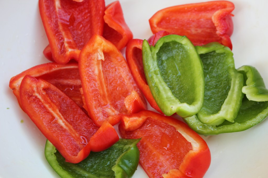 - Die Paprikaschoten und Zucchini waschen und in gabeltaugliche Würfel schneiden.