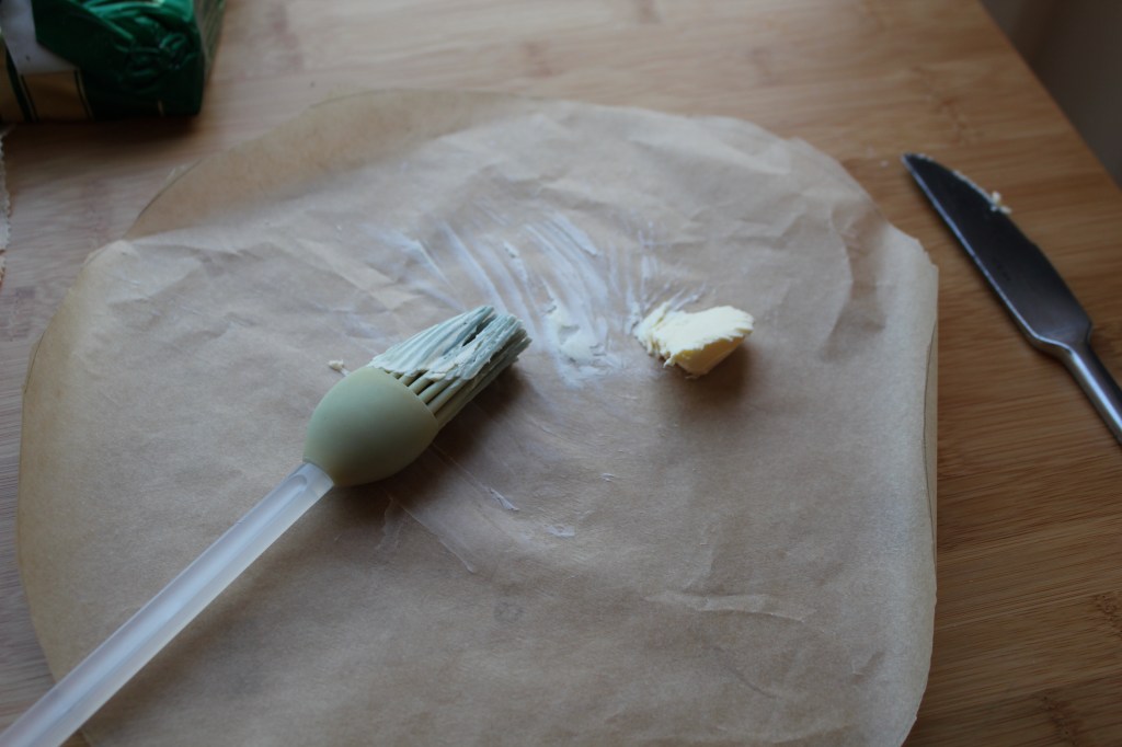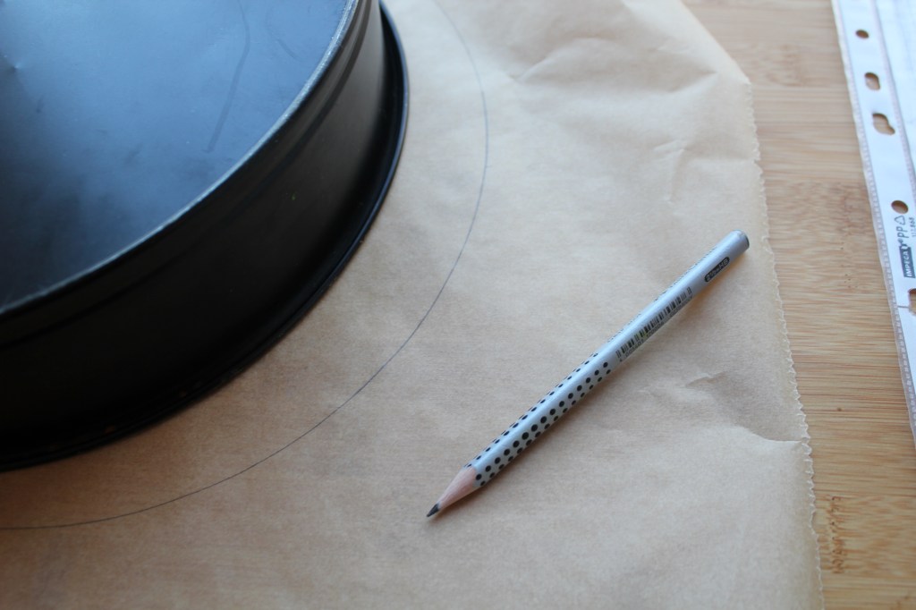 - Auf einem Backpapier den Boden Springform mit einem Bleistift umranden, um einen Pergament-Papierkreis zu erzeugen. Diesen Kreis ausschneiden und mit Butter/ Margarine auf einer Seite gut einfetten. Beiseite legen.
