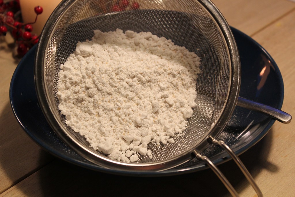 - Der Überschüssige Puderzucker auf dem Blech wird wieder in das Sieb geschüttet.