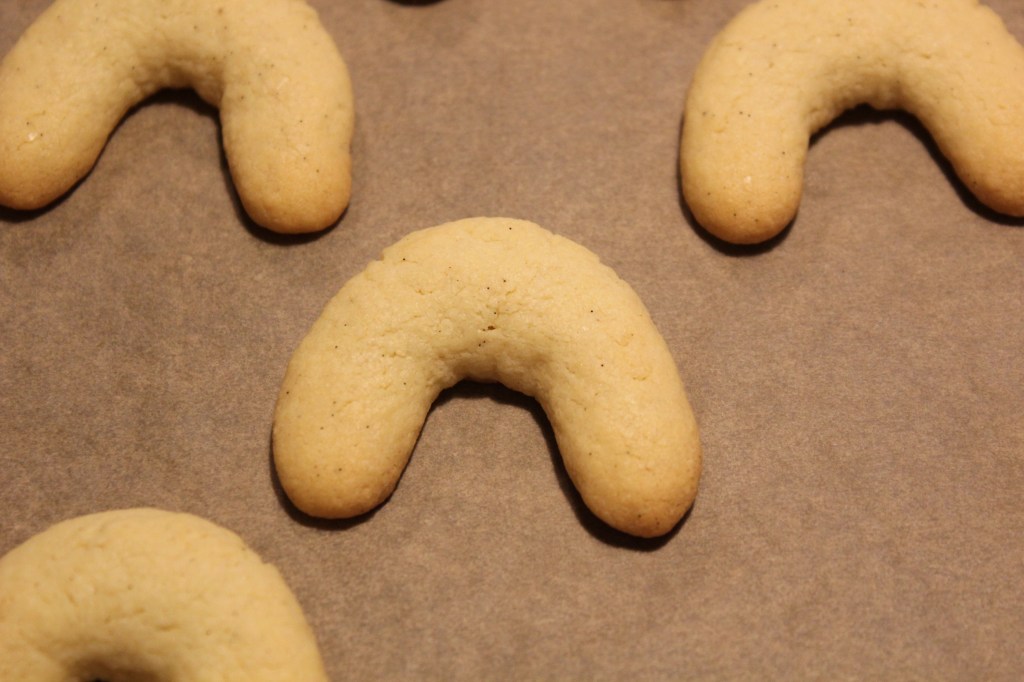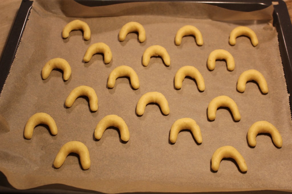 - Die Kipferl werden für 10 Minuten (evtl. etwas länger) gebacken. Wenn sie an den Enden anfangen goldbraun zu werden, sind sie fertig.