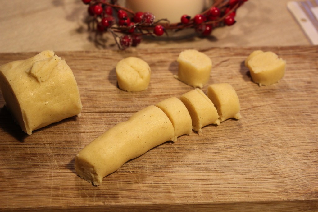 - Nach der Kühlzeit teile ich den Teig in vier Teile und rolle diese zu Rollen mit den Händen. Dann teile ich von den Rollen Stücke a ca. 10g) ab und forme diese Teilstücke zu Kipferln.